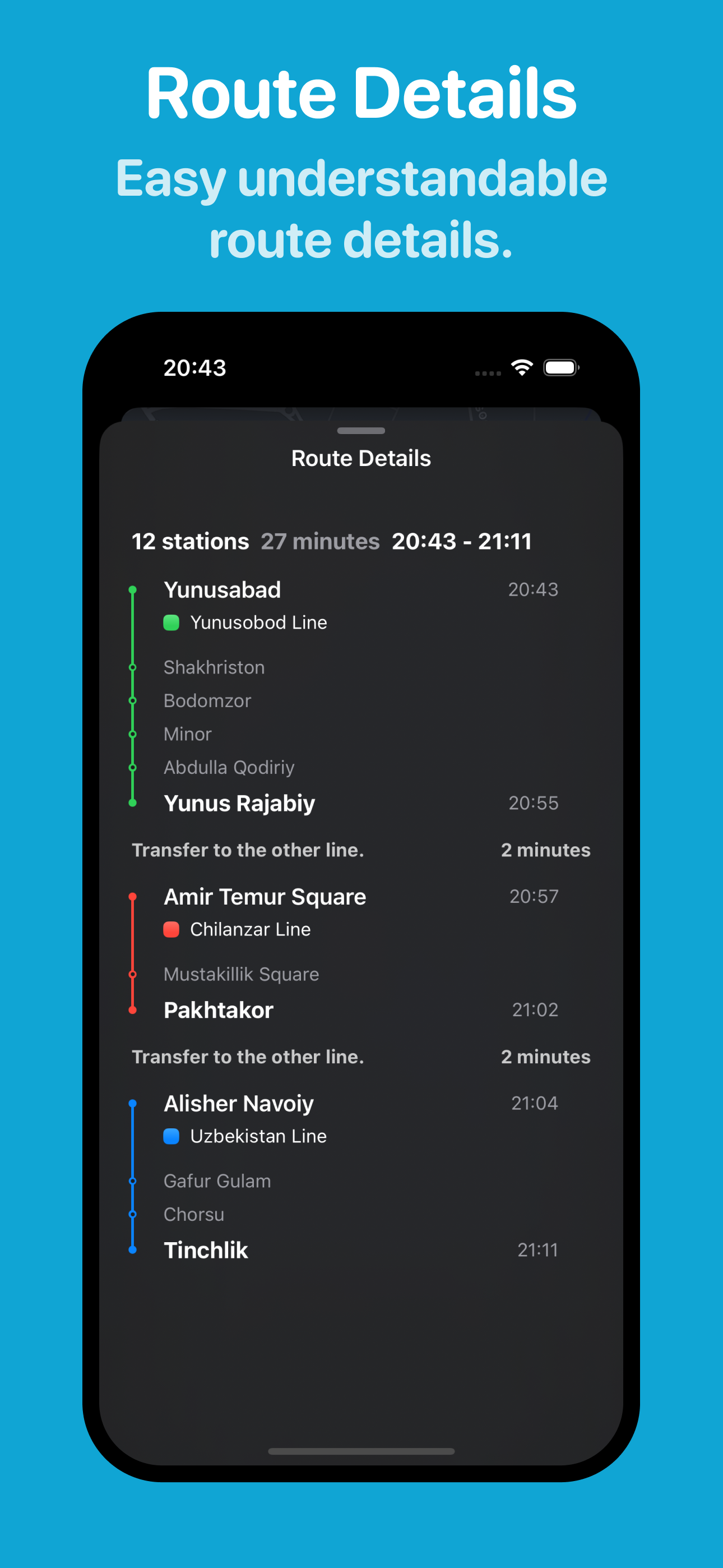 Experience the convenience of navigating the Tashkent Metro with our user-friendly app, designed to make your commute effortless and efficient.